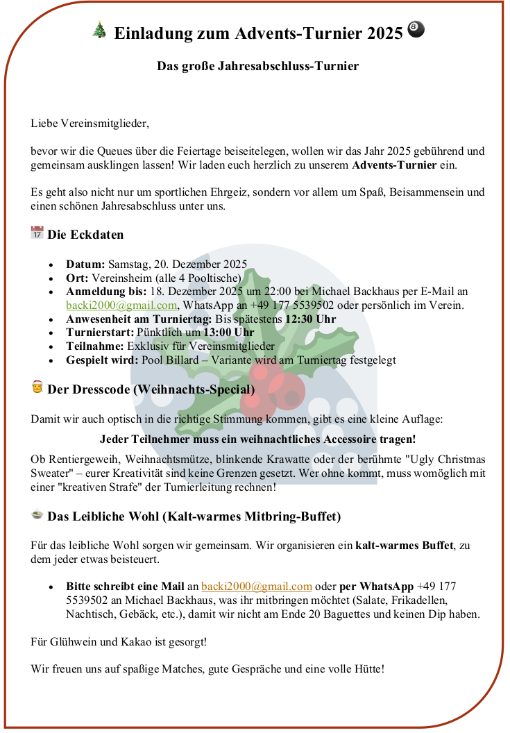 Liebe Snooker-, Billard- und Pool-Enthusiasten,
